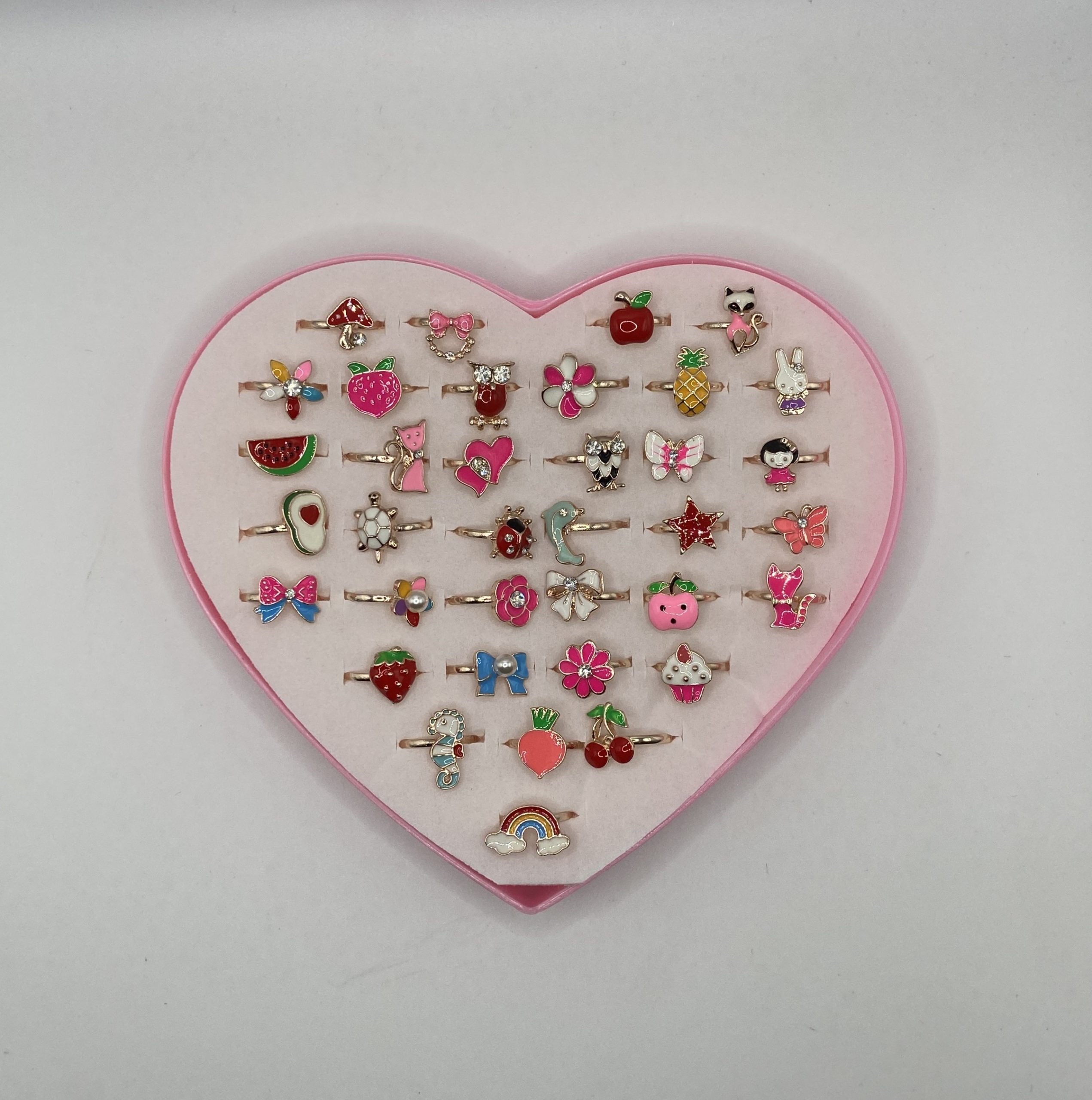 Vegyes gyerek gyűrű, szív alakú, 36 db-os kínálóban
