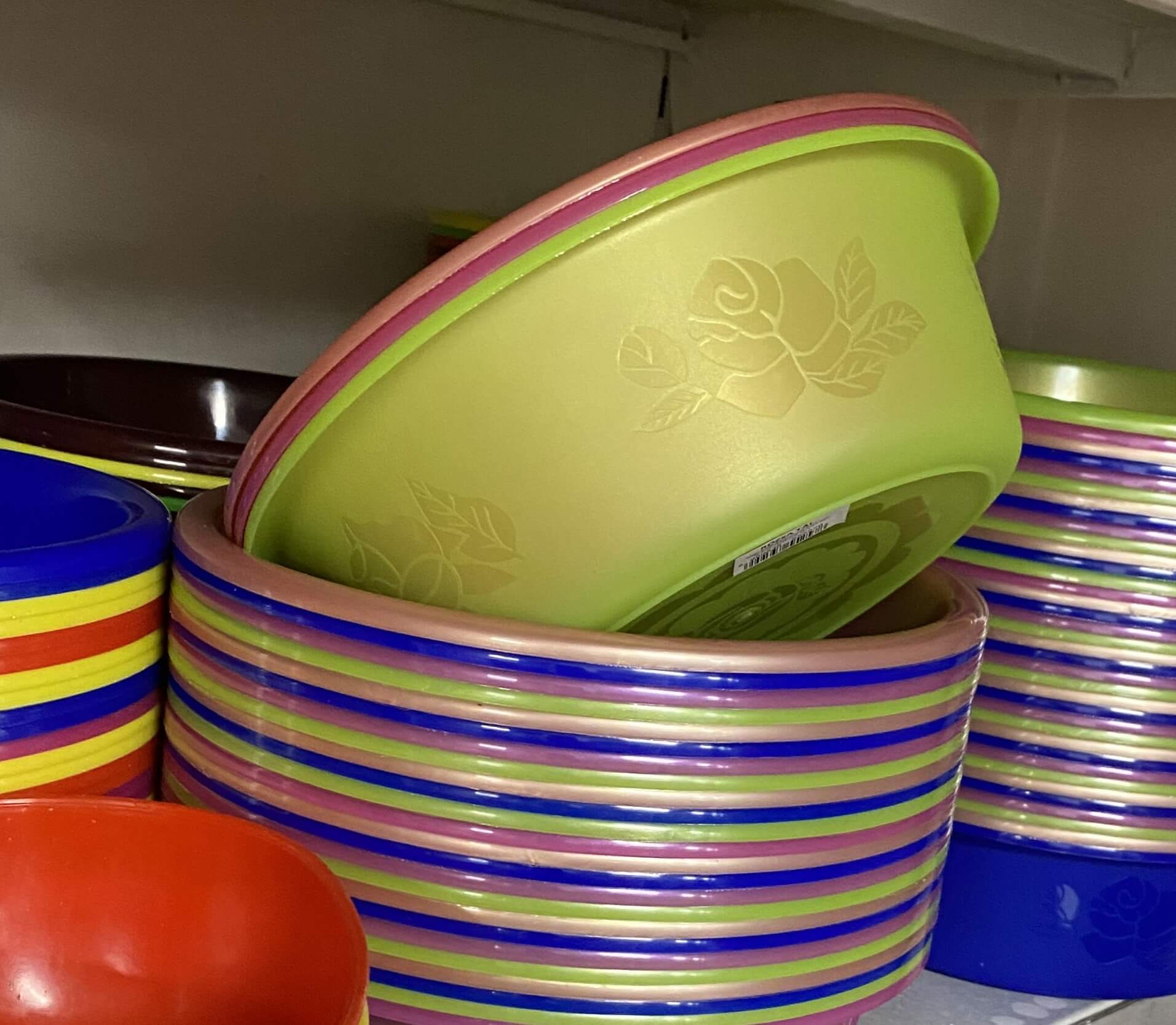 Műanyag, kerek, peremes tál, mely ideális különböző használatra a háztartásban.